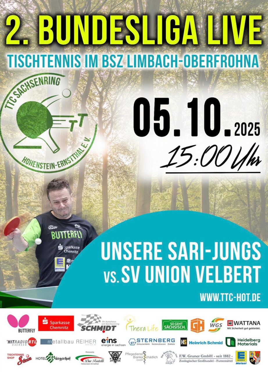 Zum dritten Heimspiel der Hinrunde empfängt der TTC Sachsenring in der 2. Bundesliga am Sonntag die Mannschaft von Union Velbert aus Nordrhein-Westfalen. Der Tabellensiebente der vergangenen Saison ist noch ohne Punktgewinn und wird versuchen, dies in diesem Match zu ändern. Mit Wim Verdonschot haben die Gäste einen Spieler auf Position 1, der Anschlusskader der Nationalmannschaft ist und alle seine bisher gespielten Einzel (6:0) gewonnen hat. Aber unsere Jungs werden alles daransetzen, zu Hause auch weiterhin ungeschlagen zu bleiben. Mit der sicherlich wieder tollen Unterstützung, wie schon in den beiden Matches gegen Hilpoltstein und Köln, dürfen sich die TT-Fans wieder auf ein Highlight in der Sporthalle des BSZ Limbach-Oberfrohna freuen. Anspiel ist um 15 Uhr.